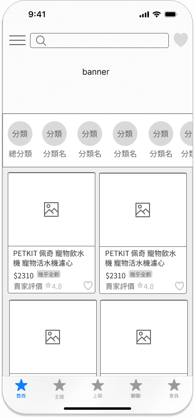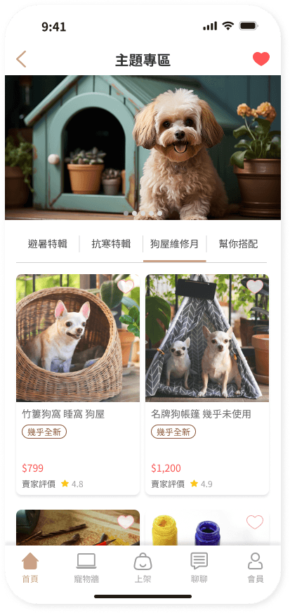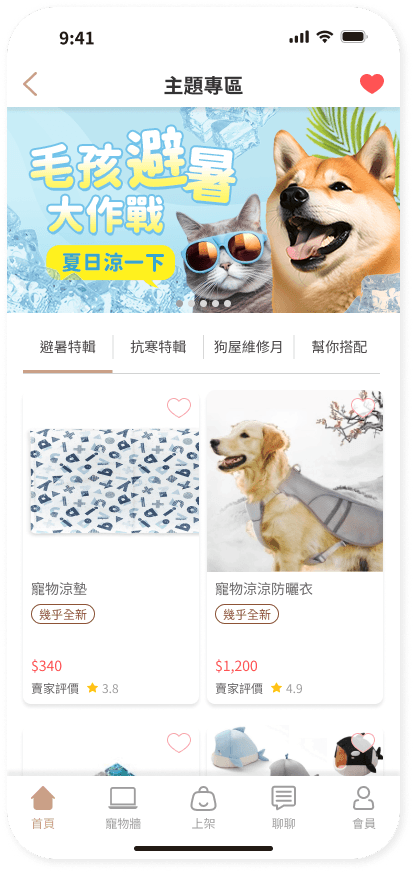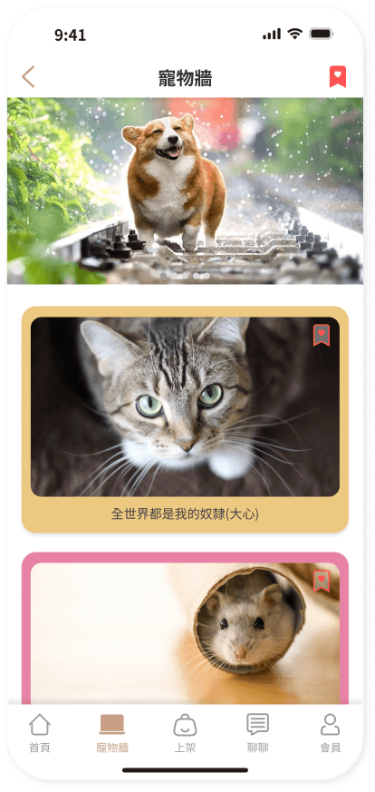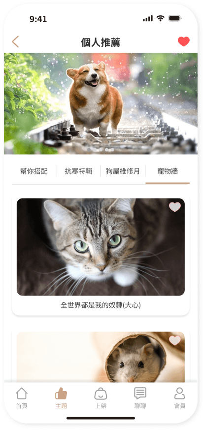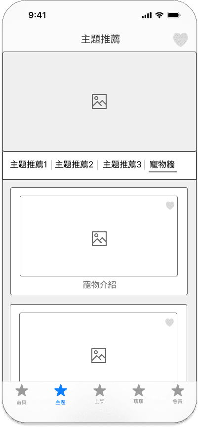 原先我們將放置寵物卡的頁面與主題活動頁面放在一起,可從下方tab bar的”主題”進入,但使用者在尋找時卻無法將主題與寵物卡聯想再一起,因而產生尋找的困難,因此我們將主題改名為”寵物牆”,並把主題活動頁面轉移到首頁的banner裡,來貼近使用者的習慣認知。