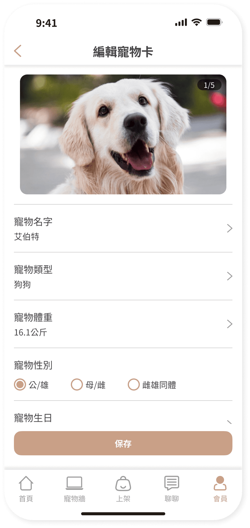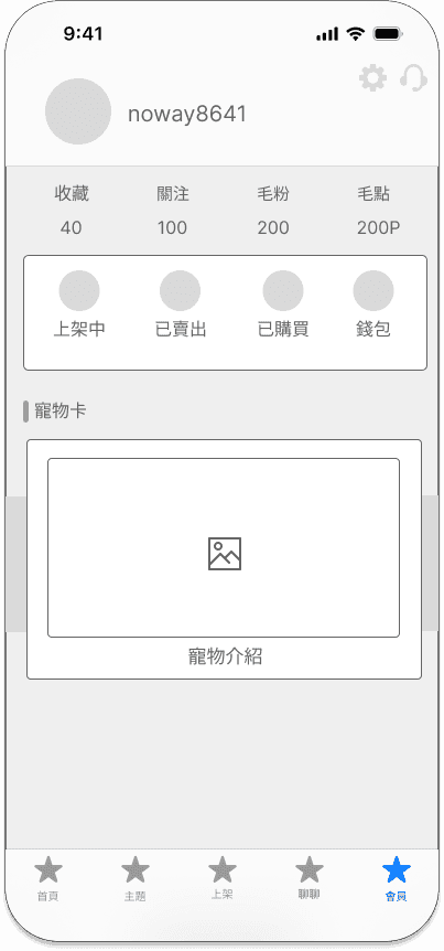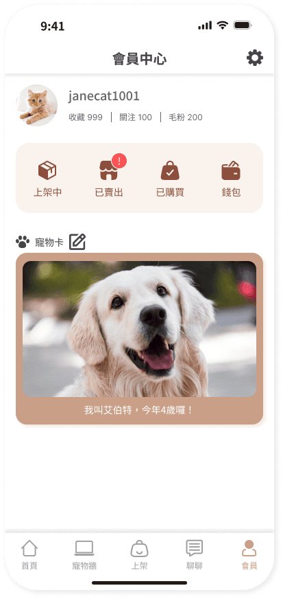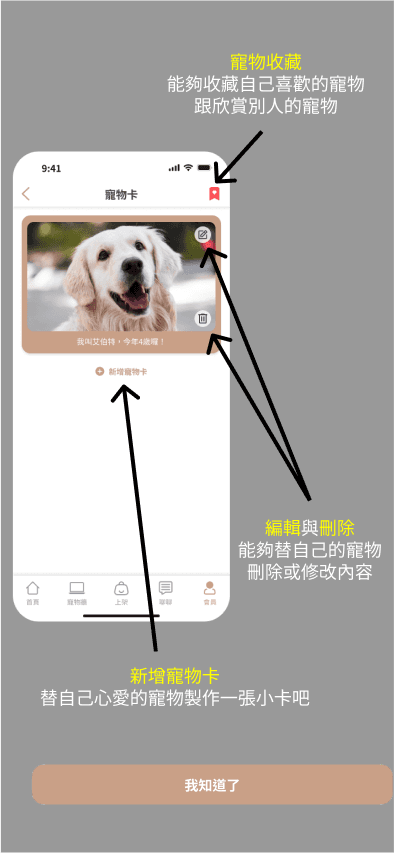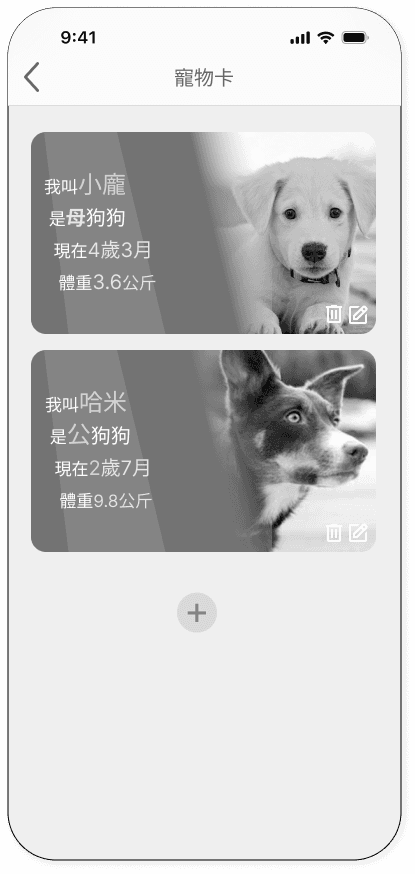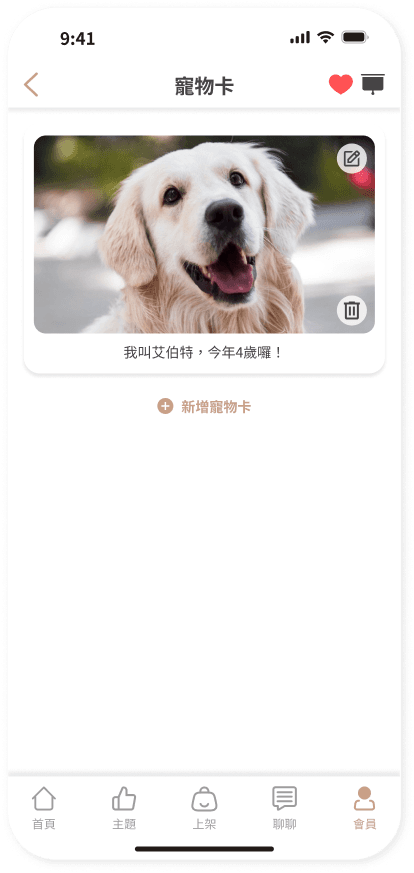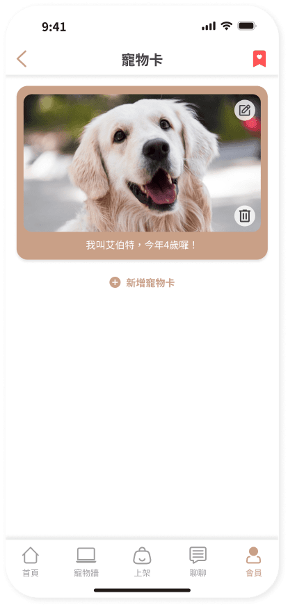 寵物卡功能讓飼主可以上傳並紀錄自己的寵物,後續將規劃讓飼主可以交流分享卡片,進一步發展成社群的核心功能,用社群(高頻率行為)帶動交易(低頻率行為),成為黏著度工具。