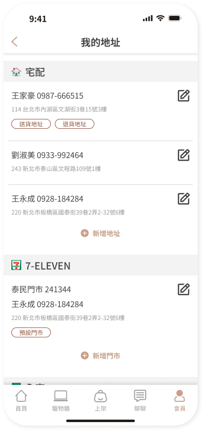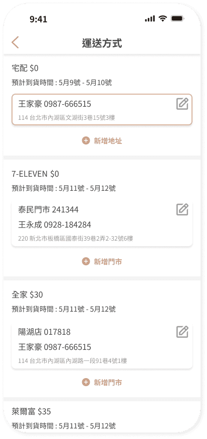 使用者可能在配送地址中存有多項地址,需點擊進入才能知道自己的地址是哪一個,因此我們將地址安排到第一層的畫面即可預覽到,無須每次使用都要點擊進去確認。
