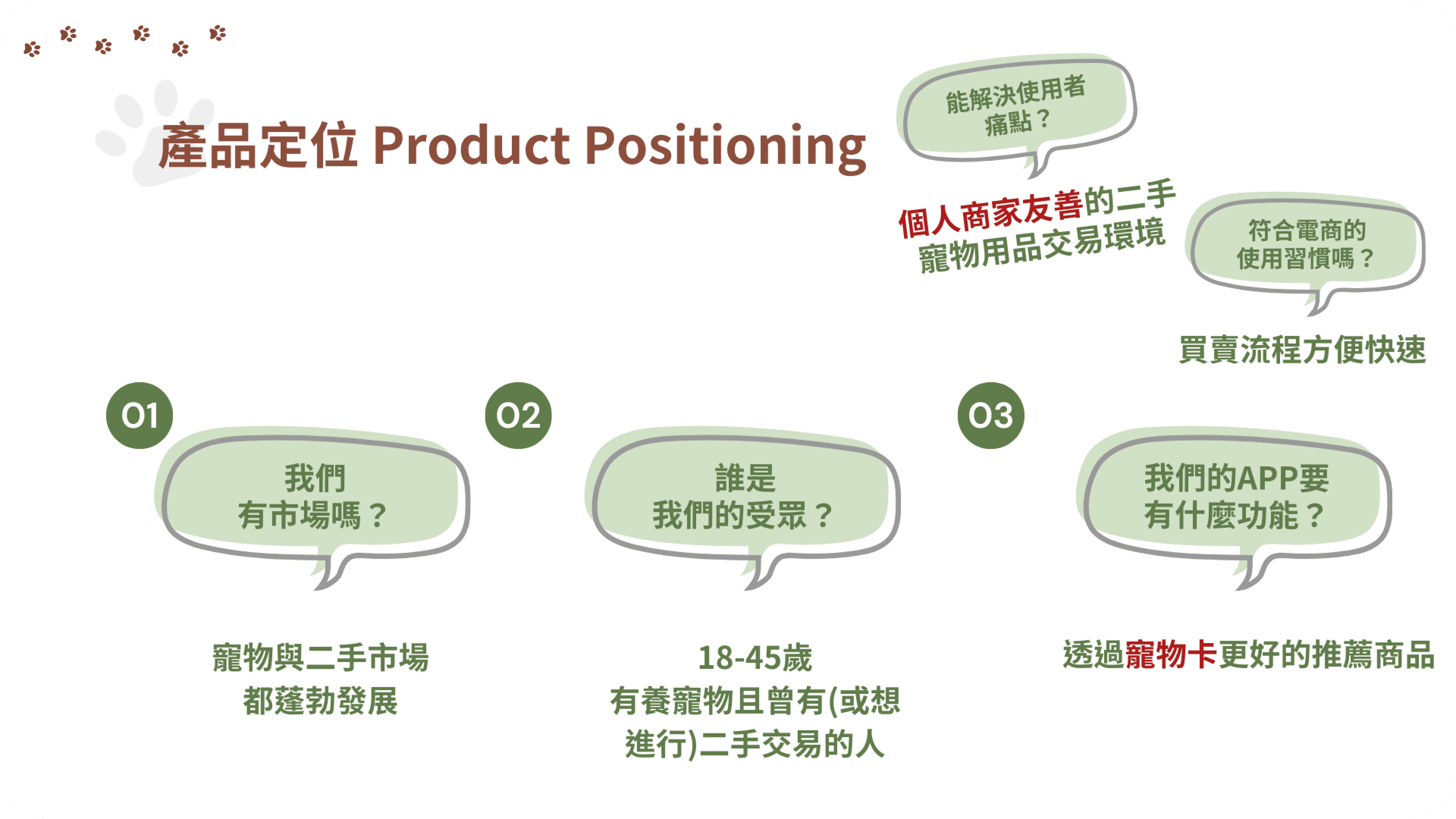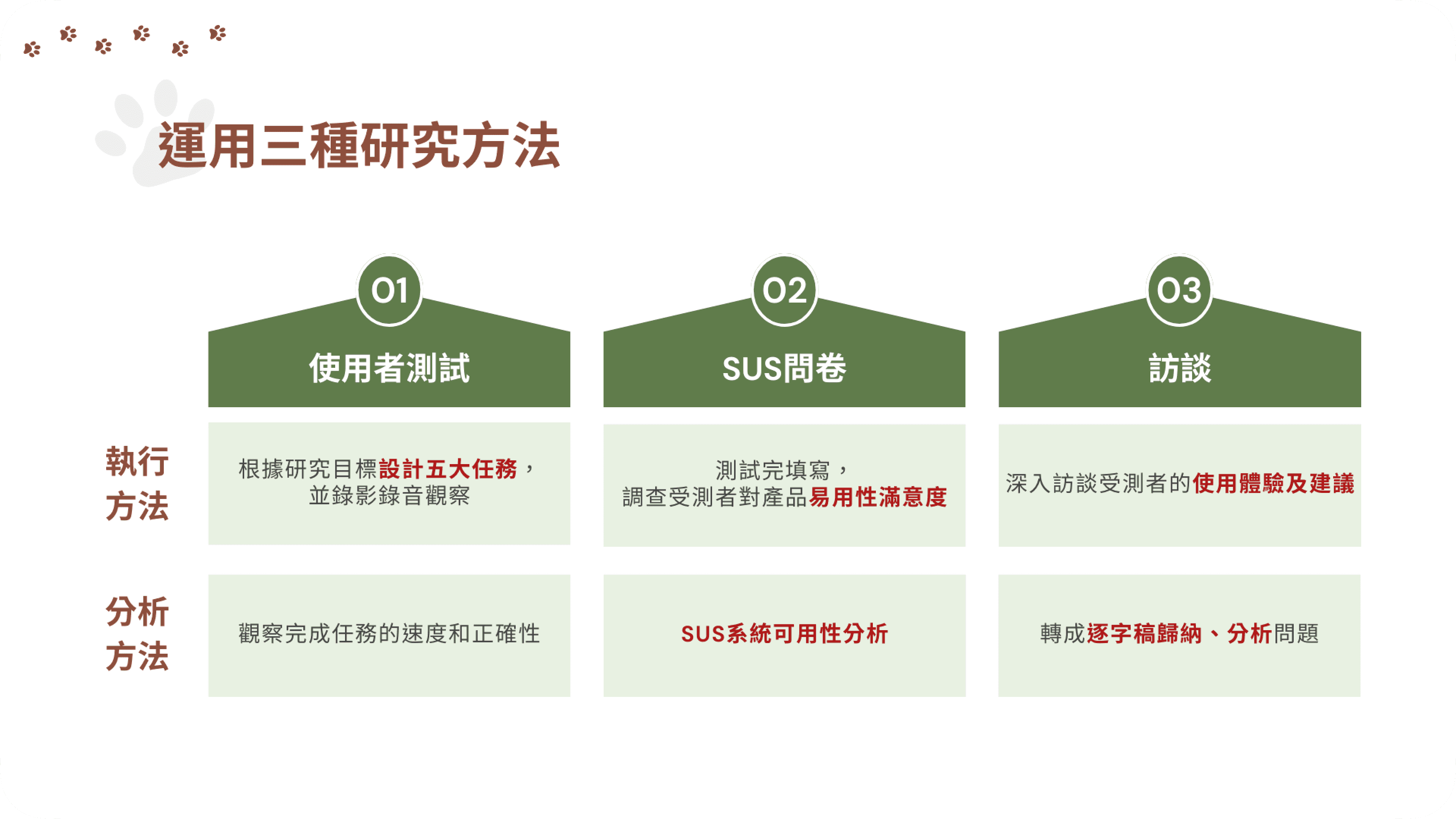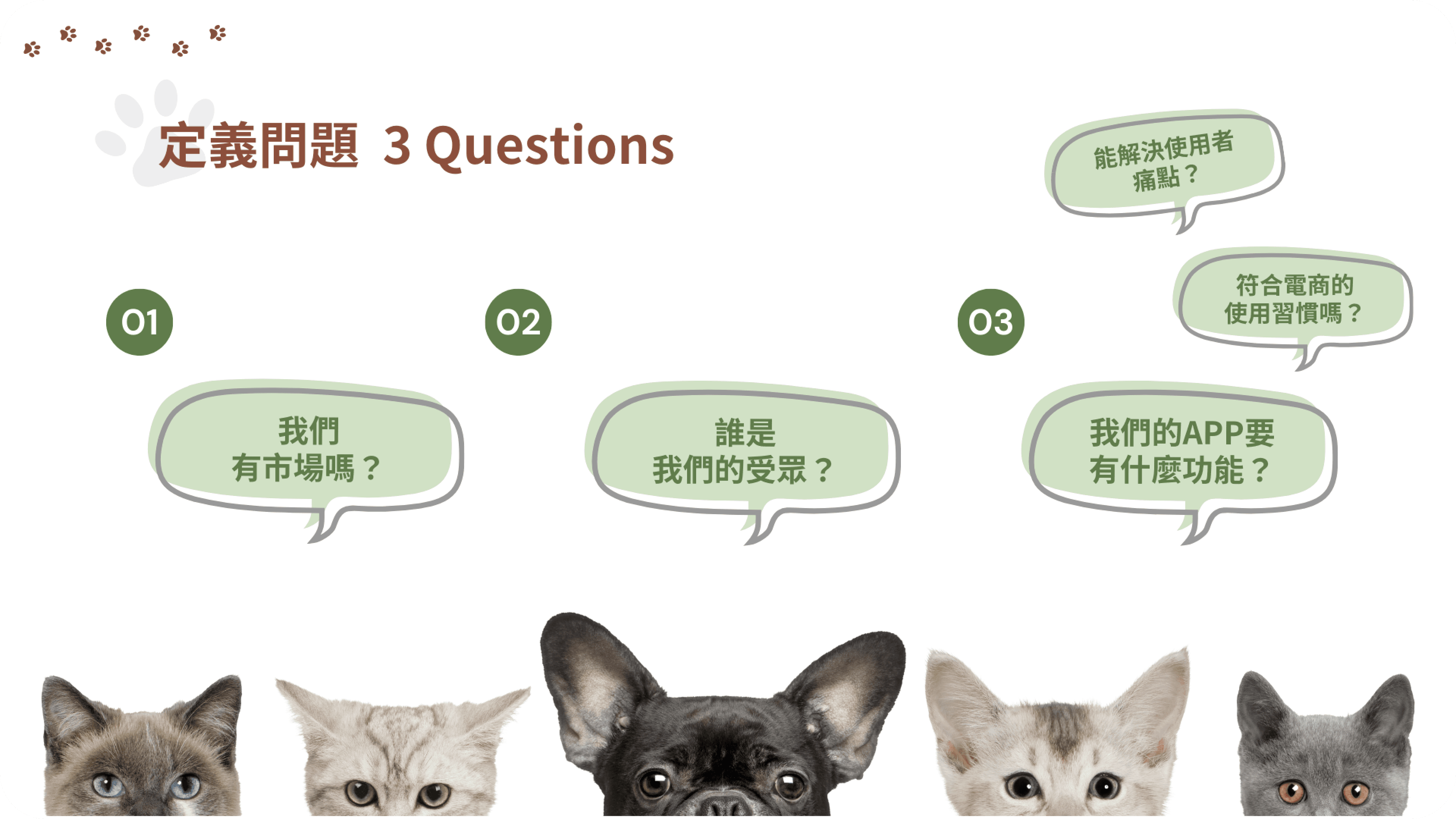 我們發現問題主要集中在寵物照護、寵物對生活與環境的影響。而我們也對此重新定義了問題——回歸到情感需求,在少子化時代為何寵物的飼養數逐年增加?「因為人們有陪伴的需求」,即使寵物會破壞家具、影響睡眠,但在日常生活中帶來的陪伴能療癒、舒緩現代人的壓力與抑鬱,因為情感,飼主願意無條件付出,花錢送寵物到寵物學校、美容保養、承受他們帶來的一些負面影響,因此我們認為真正的問題是