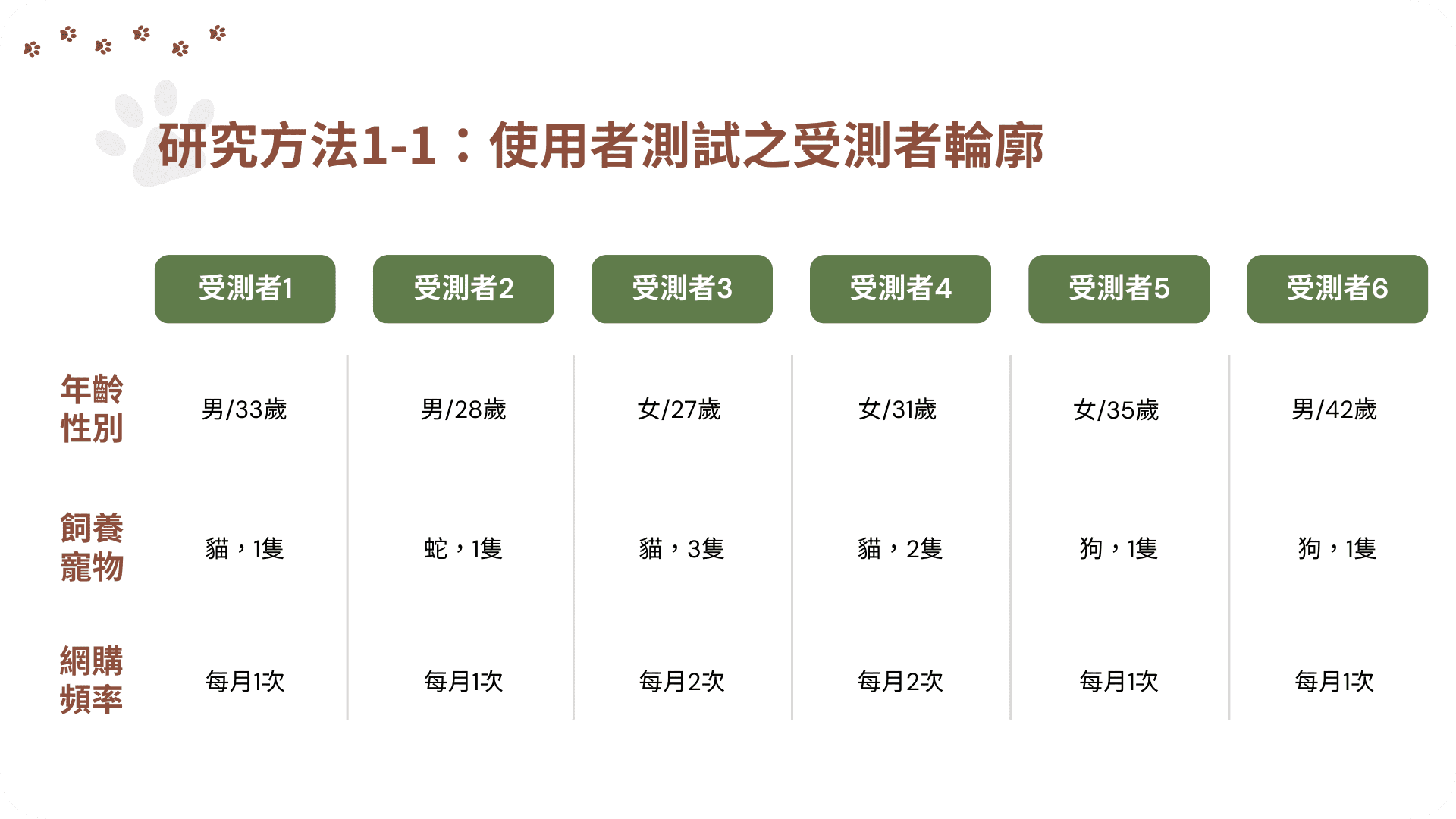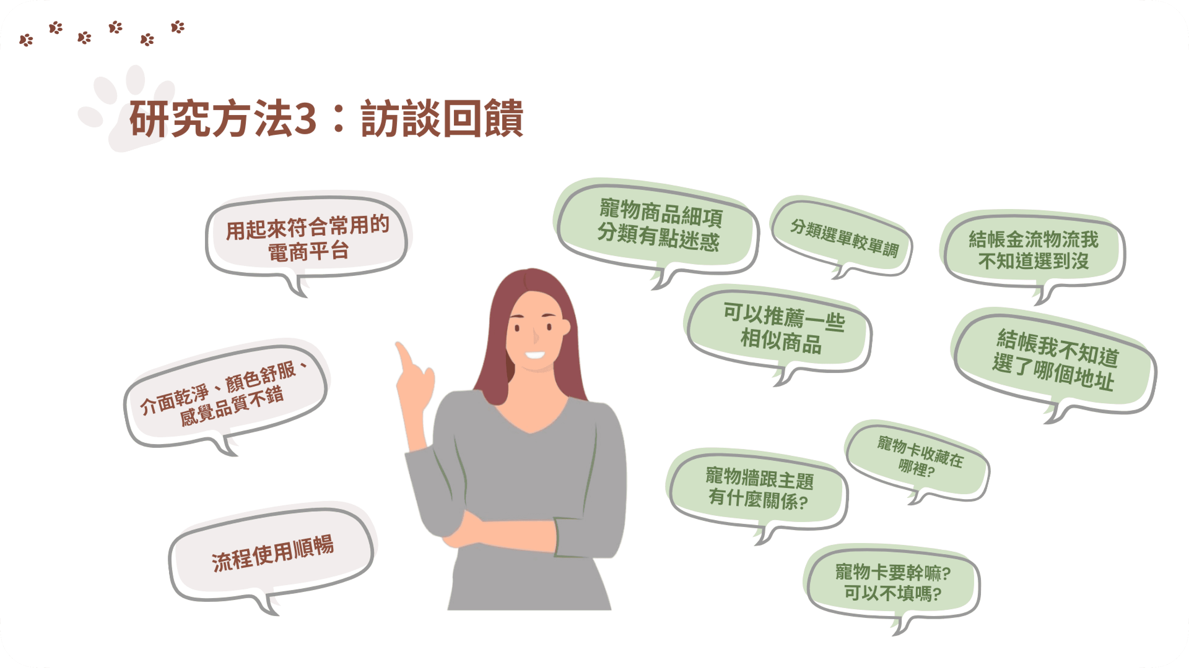 為了更瞭解寵物以及飼主,我們進行質化研究,發現以下較為常見的問題:相關用品買來後寵物不使用或用不到,用不到的物品放在家佔空間;寵物小時候狀況較不穩定,容易發生意外;寵物破壞傢俱;寵物不親人、挑食;醫療與喪葬費用高昂;剪指甲&洗澡不配合;新手照護知識不足;半夜被寵物打擾導致睡眠不足;寵物離世而心情低落;允許養寵物的租屋數較少(或需簽寵物條款)。