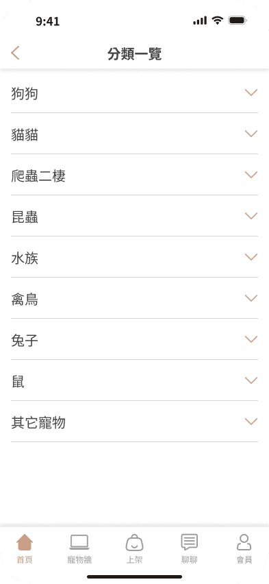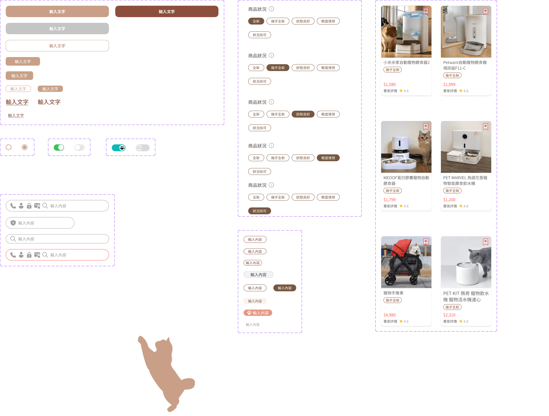 在這次設計中我負責寵物商品搜尋的功能以及全寵物商品的分類設計,然而各種寵物有其相關的專業知識,尤其是貓狗外的寵物用品分類較為陌生,例如水族生物以及昆蟲。如何讓買家能從不同的分類找到寵物商品,並能理解寵物分類命名的意涵是我本次設計遇到的重要挑戰,因此我盡可能參考多家線上寵物商店的分類命名形式,嘗試從中歸納與掌握商品分類邏輯,並多次與組員討論,再經由易用性測試驗證與調整,讓我深刻體會到設計迭代的重要性。