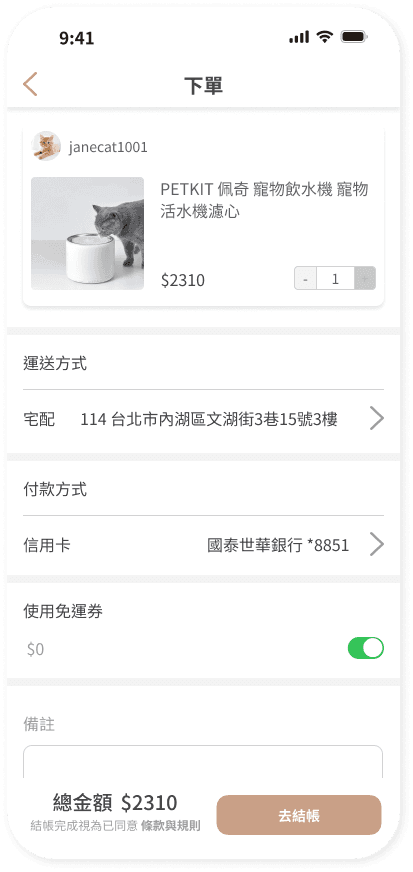 原先在寵物卡的功能中只有使用教學,讓受測者對此陌生功能產生疑問,甚至興致缺缺,因此我們增加說明文件,並且以商品的免運券做為誘因,增加使用意願。
