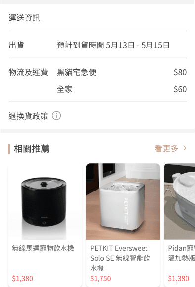 訪談中得知使用者在替寵物購買用品時,有時會遺漏或未意識到有其它用品也是需要一同購買的,因此我們在商品資訊最下方新增相關商品的推薦,也能為平台與賣家帶來更多收益。