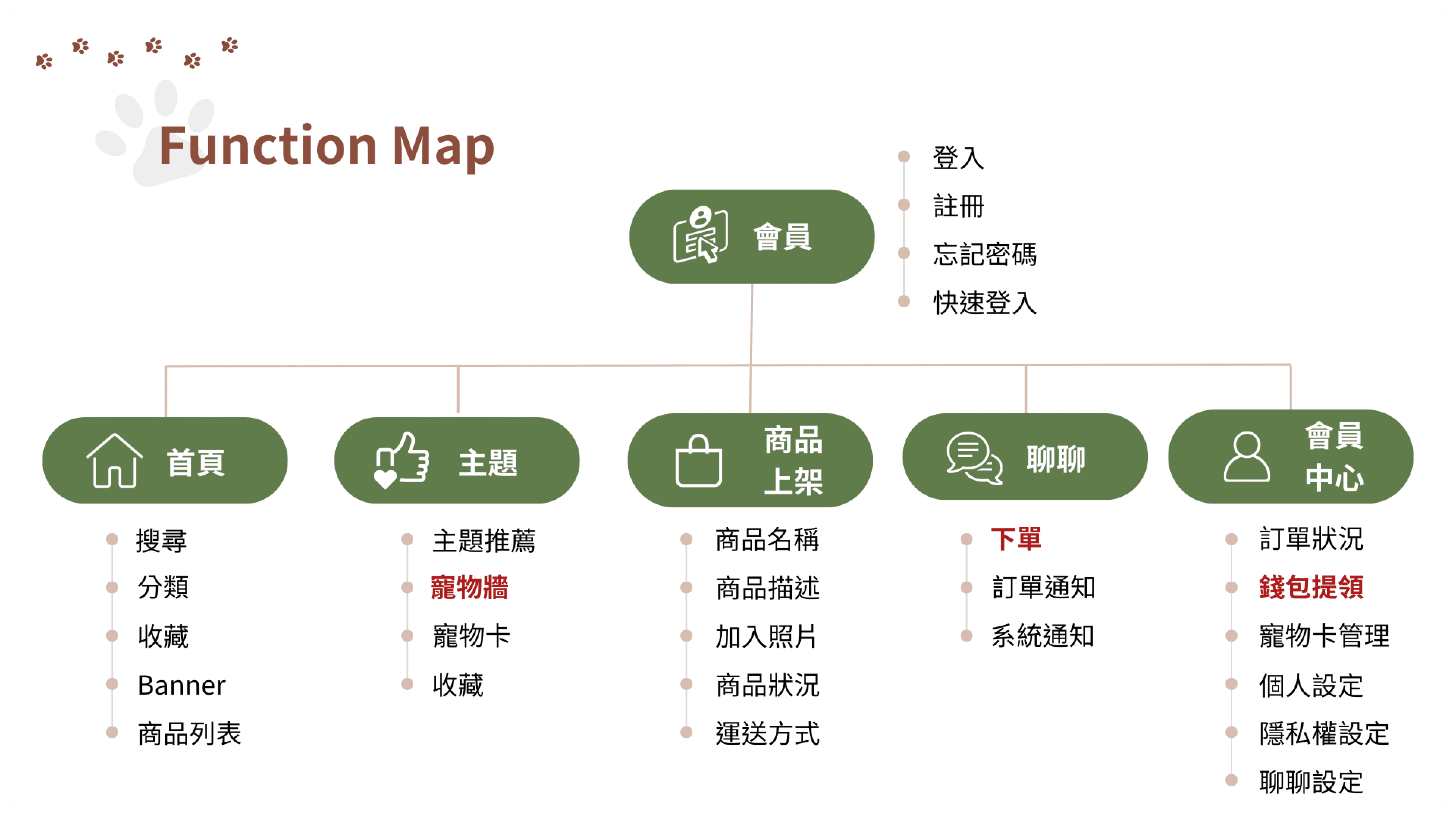 緊接著我們將各發展功能歸納成功能地圖,以利接下來的wireframe繪製。