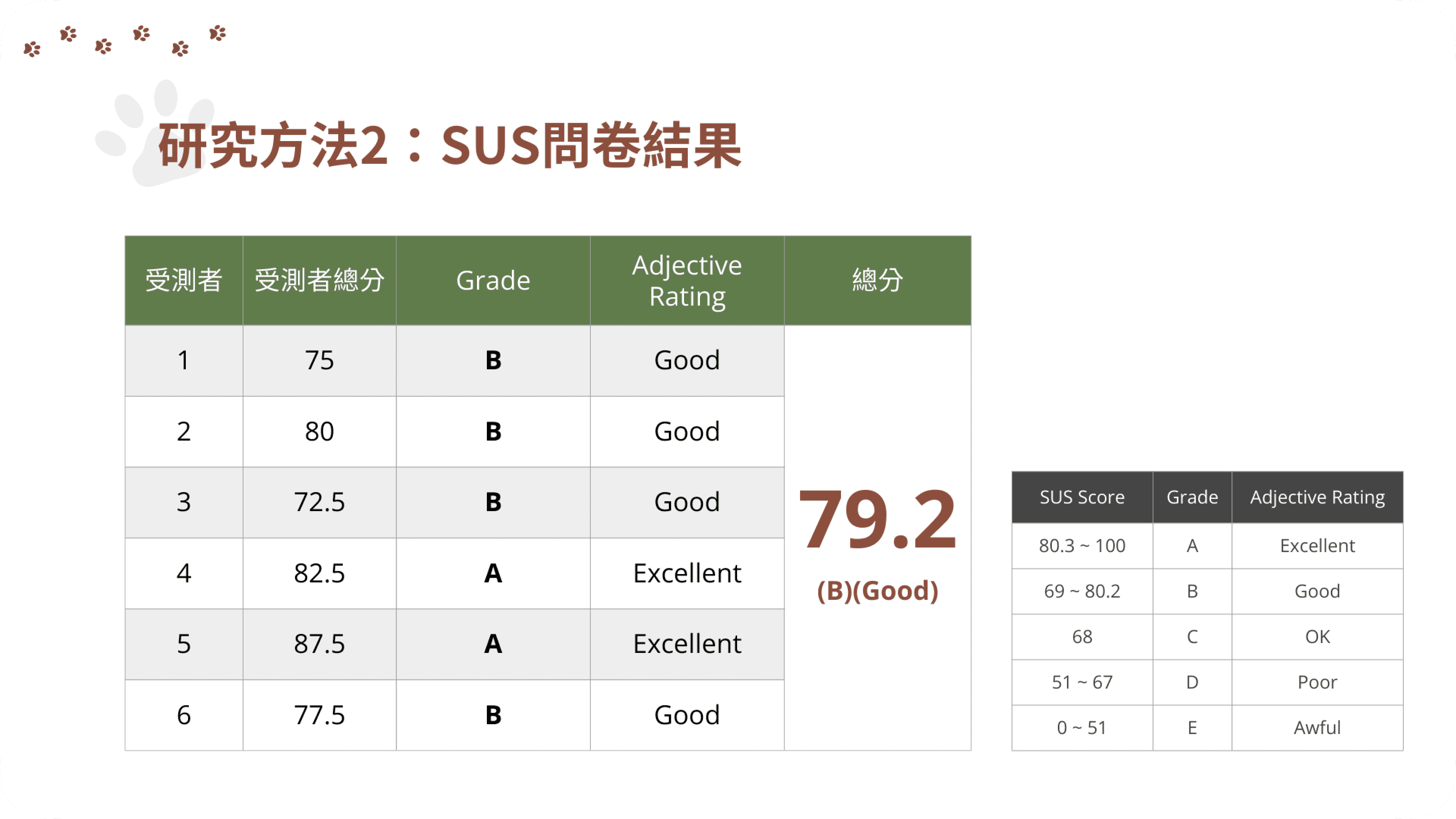 我們使用SUS 量表做為易用性評估工具,得到79.2分的成績,此成績在Aaron Bangor、Philip Kortum、James Miller 三位學者於JUX期刊中提出的易用性評分標準中,可被定義為好用(Good),僅次於最高評價(Excellent)。